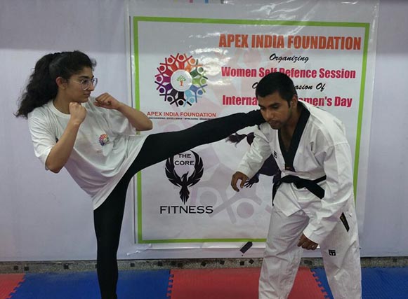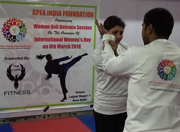 Apex India Foundation Organized a brief self defense session on the occasion of “International Women’s Day 2018”* at Lajpat Nagar-1,New Delhi. We felt the need and took a step ahead to support women empowerment in assosiation with “The Core Fitness”. Especially for women, It is utmost importance in the kind of the world we live in today. Women, usually referred as the weaker sex, are considered easier targets. In a country like India where the cases of gender violence are on rise, out of which many go unreported, self-defence for women has become a necessity more than ever.